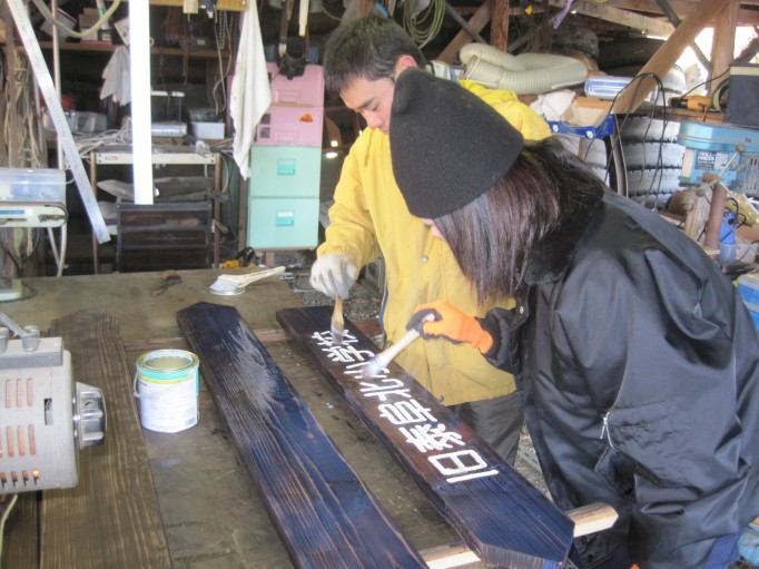 文字彫り→焼き→文字入れまでを前までにしておいて、この日は腐食防止処理→柱取り付け→設置完了までを行いました。