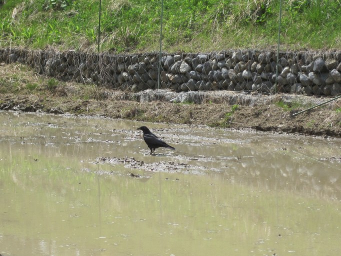そうそう、代かきをしていると、カラスがどこからともなくやって来て、起こした後の田んぼに入って