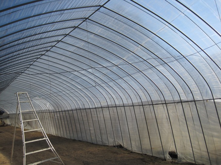 見事成功。作業の妨げになりにくくなりました。完全に邪魔にならない位置で張る状態がハウス補強