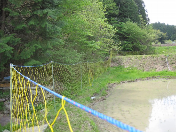 他の田んぼでは、田植え直後にネットを張らなかったもんで早速に鹿に入られて稲を食べられてしまったそうです。