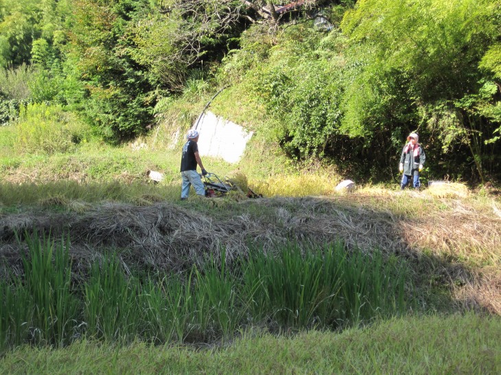 機械で刈れないところ(ぬかるんでいる所、イネが倒れてしまっているところ)をまず手で刈って、