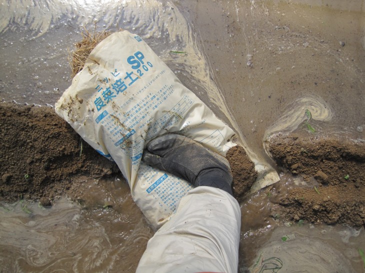 早速ポンプアップで水を流し込みましたが、溝が浅いところで堤防決壊が起こってしまいましたorz
