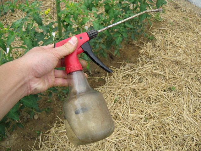 トマトハウスにて、トマトの着花、結実、肥大促進の成長ホルモン剤「トマトトーン」を散布。
