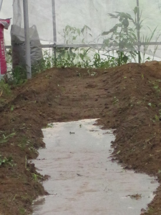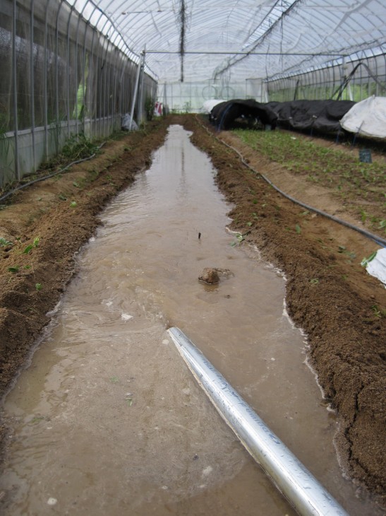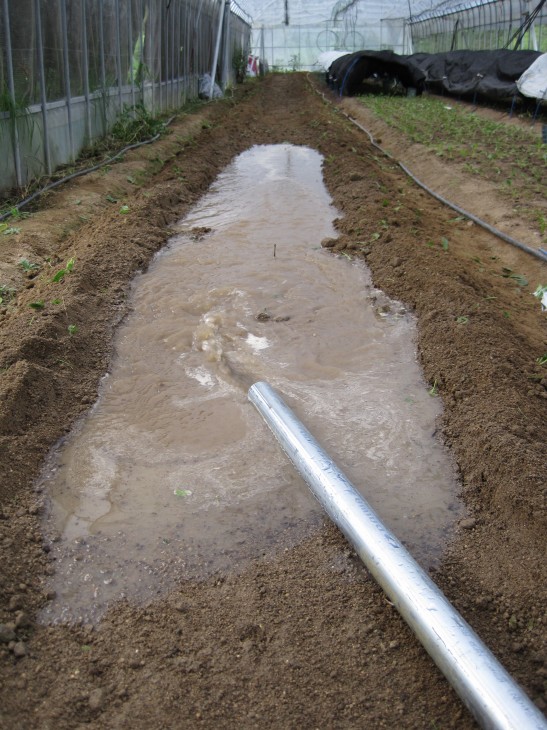 畝の中央部に溝を作り、水を流しこんで地下水とつなげます。