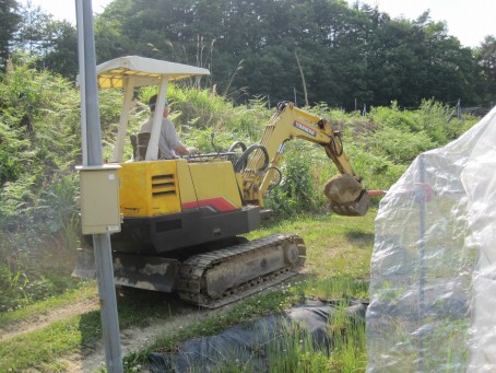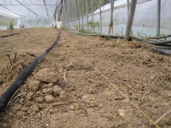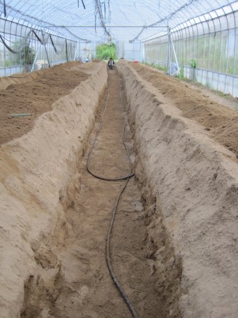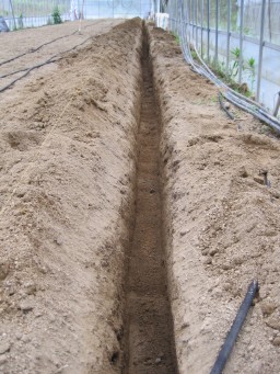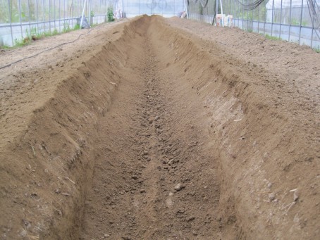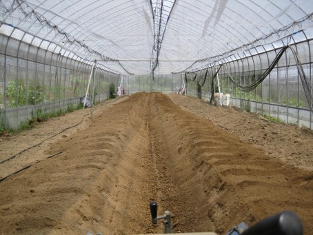 2棟計6畝あるうちの2畝に、潅水パイプを埋設するためにハウスの中で一生懸命溝を掘っていました。