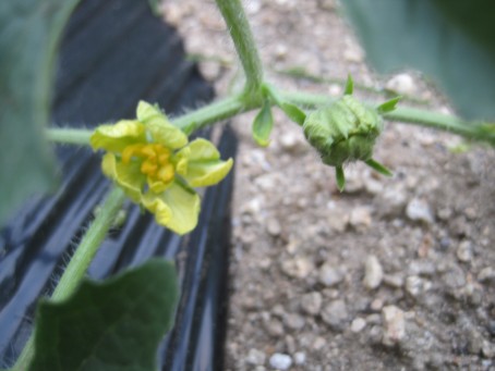 スイカ。茎が折れていたものの、強靭な生命力によって花もつけました。