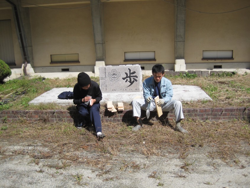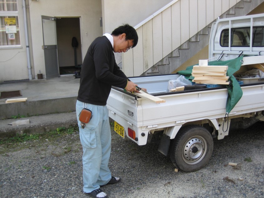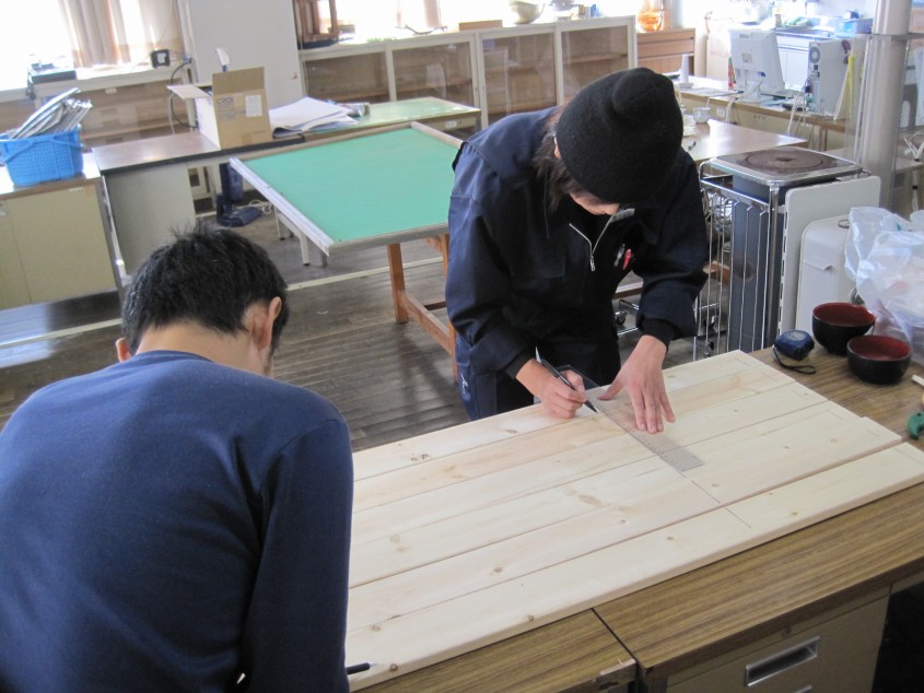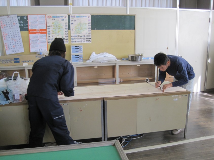 旧北小学校職員室、現在の協力隊の事務所にて、元となる木材を切るために採寸します。