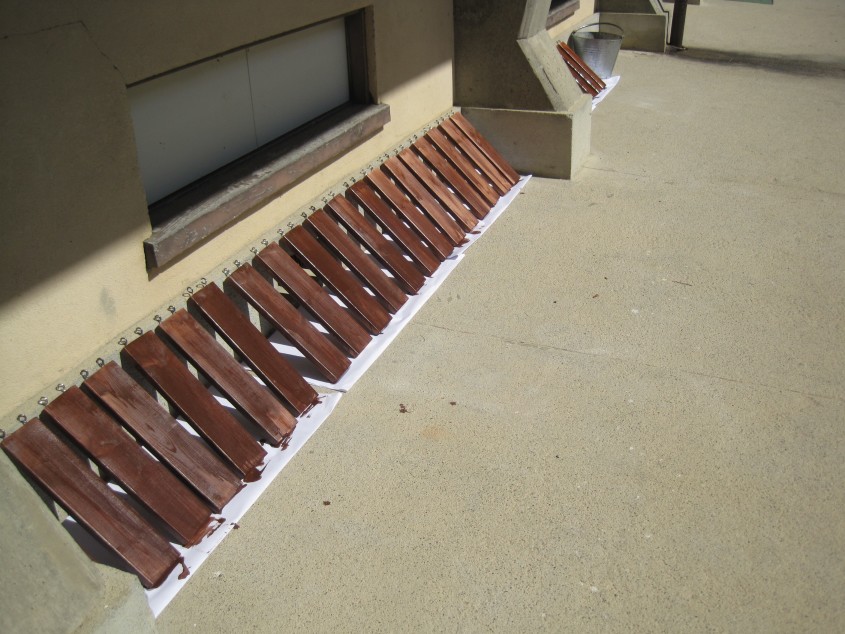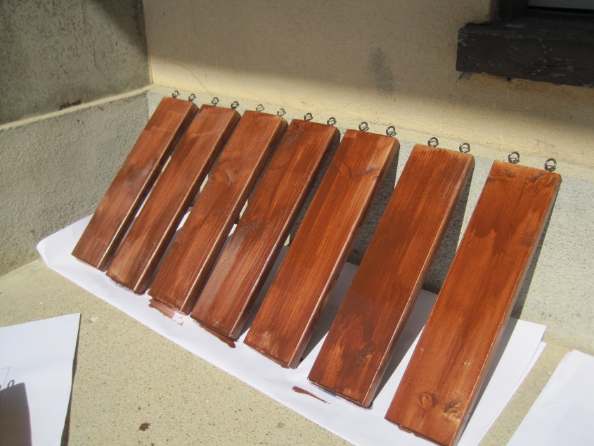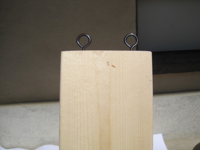 Lネジにひっかけるための丸ネジを取り付け、防腐、防虫などの効果のある耐候性着色ニスを