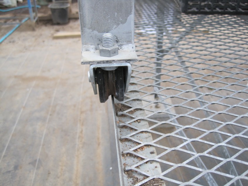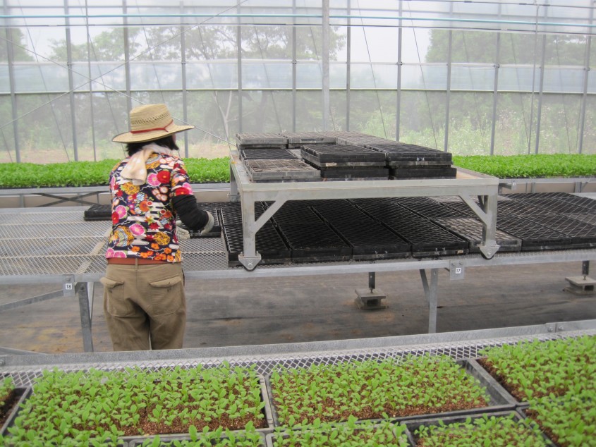 棚が移動式になっており、女性でも一度に大量の育苗箱を遠くまで移動させることを可能にして