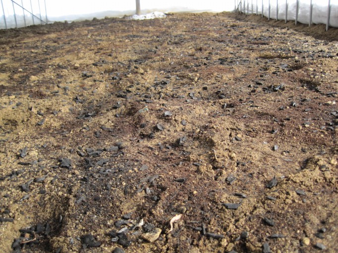 吹雪の中でもハウス作業をしました。つっちーにも手伝ってもらい、土づくりのための堆肥と、一部竹炭を