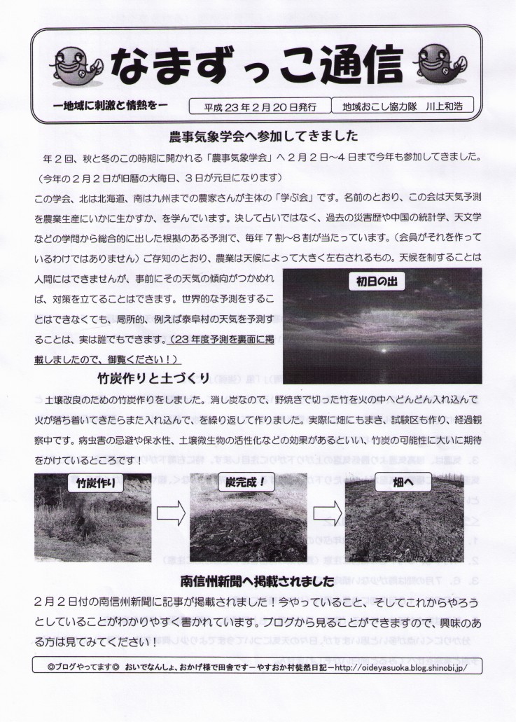 地域おこし協力隊の活動を紹介する、月1回の活動紙「なまずっこ通信」の2月号です。