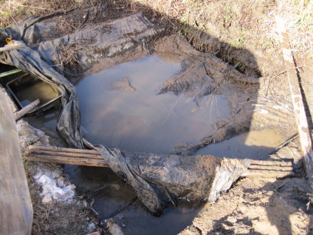 水がなくなったところで、最近気になっていた貯水池の修理と掃除を行いました。