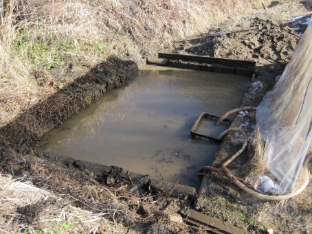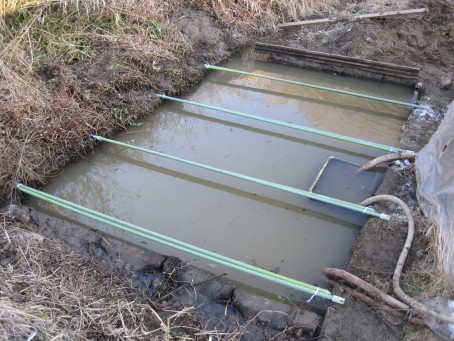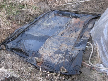 藻が張らないためにかけていただろう遮光ネットが長い間蓄積した草や泥で一部中に入り込んで