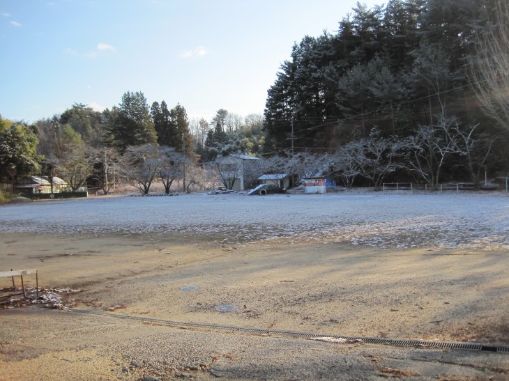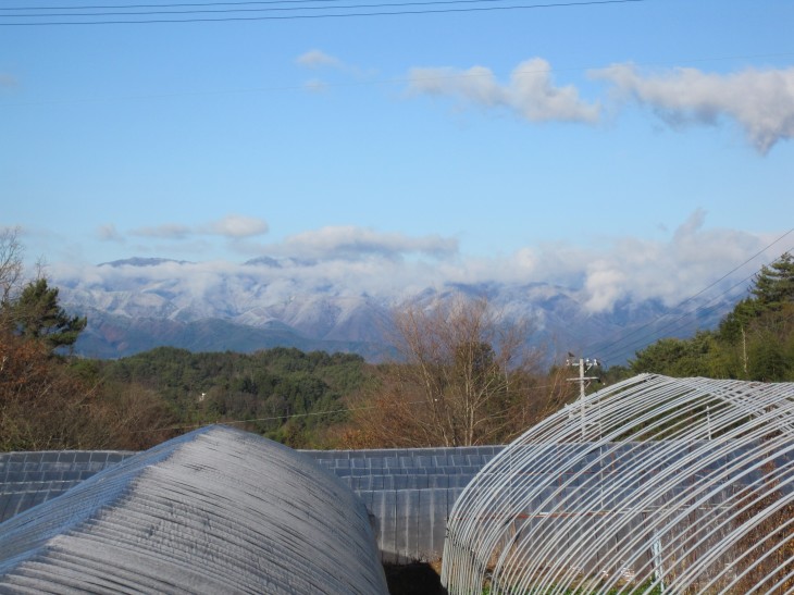 泰阜村からみる対岸の山肌も薄白くなっていました。