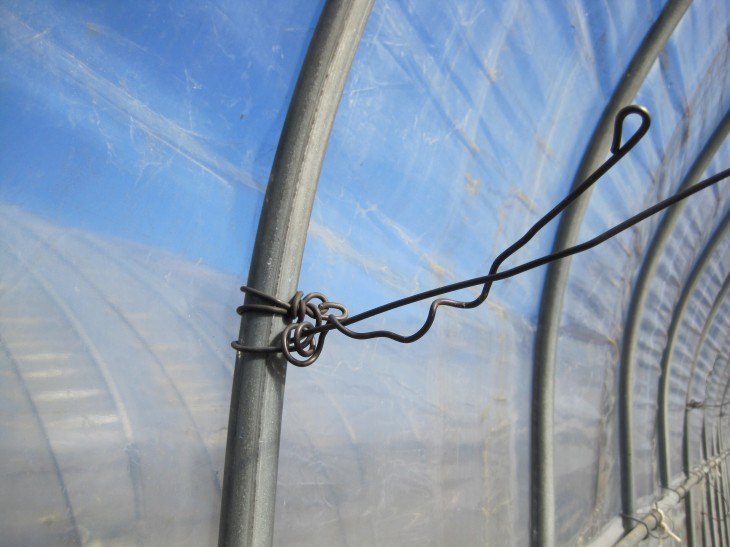 見事成功。作業の妨げになりにくくなりました。完全に邪魔にならない位置で張る状態がハウス補強