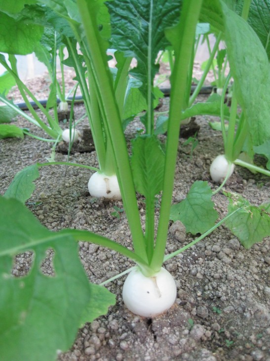 先月試験で蒔いた聖護院大根、カブ、小松菜、水菜がこの1週間留守にしている間にかなり伸びて