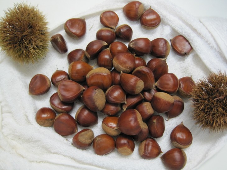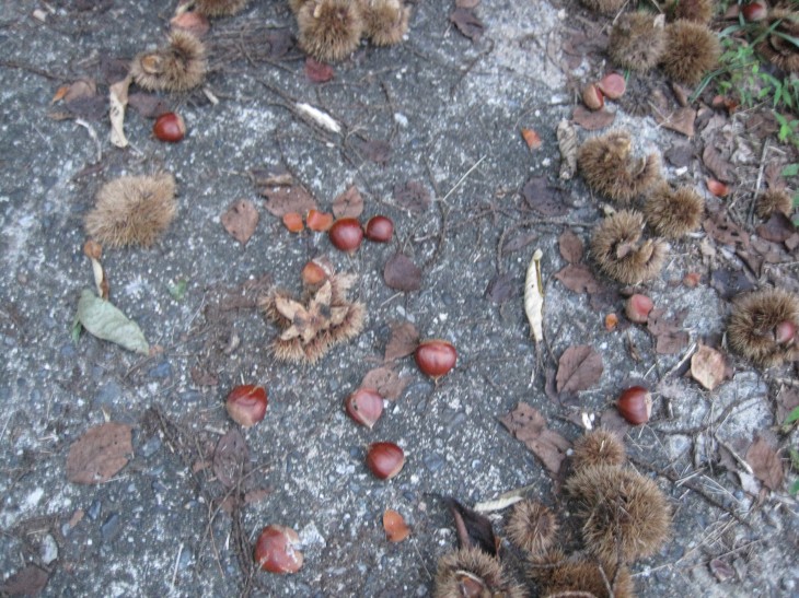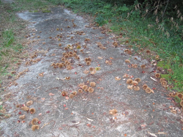 さらに、育苗箱を管理する棚を解体して出た資材を元の場所へ戻す途中、栗が大量に落ちていました。