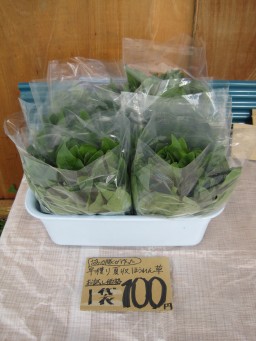 「協力隊が作った 早穫り夏収ほうれん草 お試し価格 1袋100円」