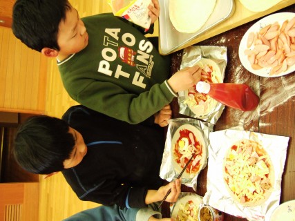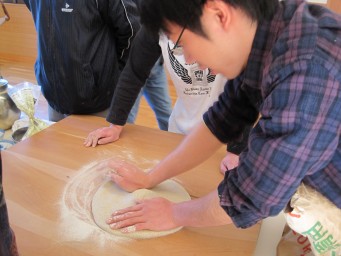 自分もいっちょまえなことを言いながら、生地の伸ばし方を教えています。
