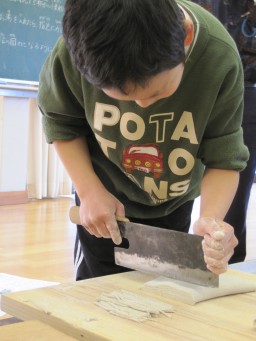 小学生も一生懸命大きな包丁を両手で持ってきっています。