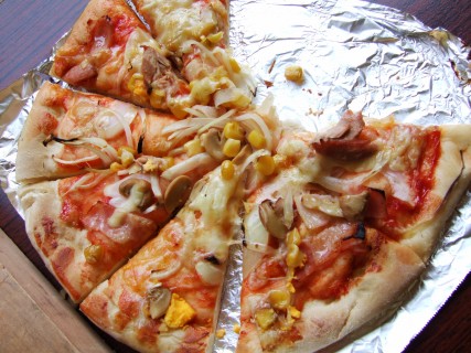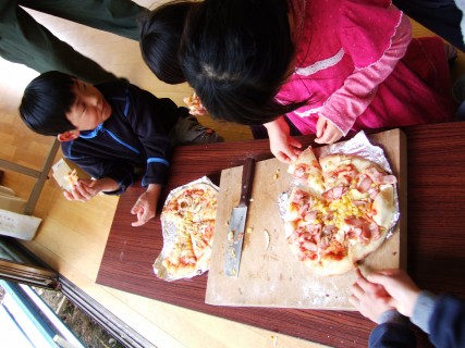 先にピザが出来て食べている間にかやかやそばを茹でて茹でて・・・完成!