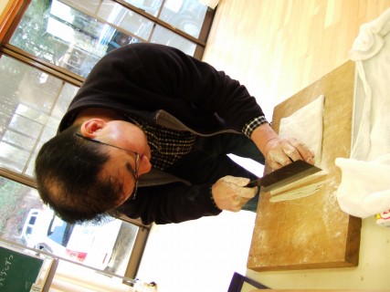 最初に手のひらで少しずつ外へ外へ伸ばしていきます。中央はちょっと残しておき、延べ棒で徐々に