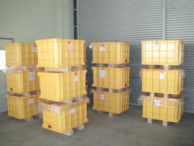 アク抜きとは違って、生の状態で規格ごとに250gの束にして、コンテナに並べ、塩とワラビとを交互に重ねていくわけです。