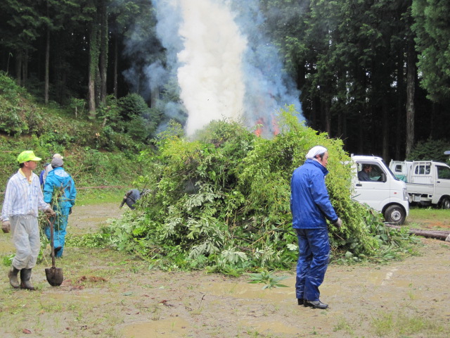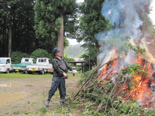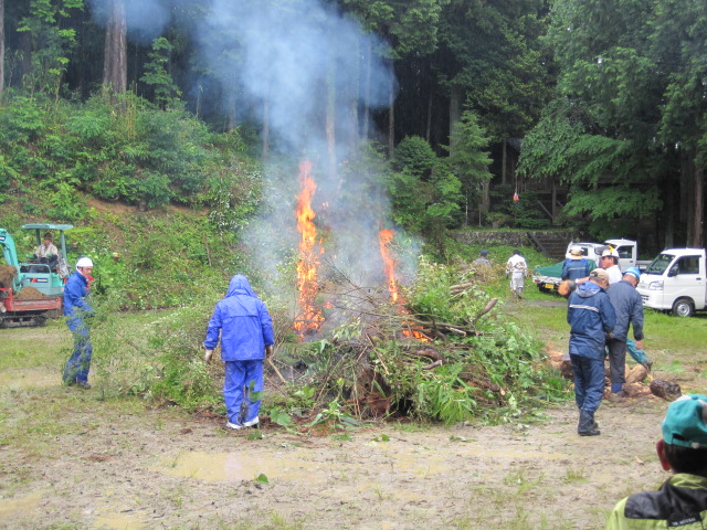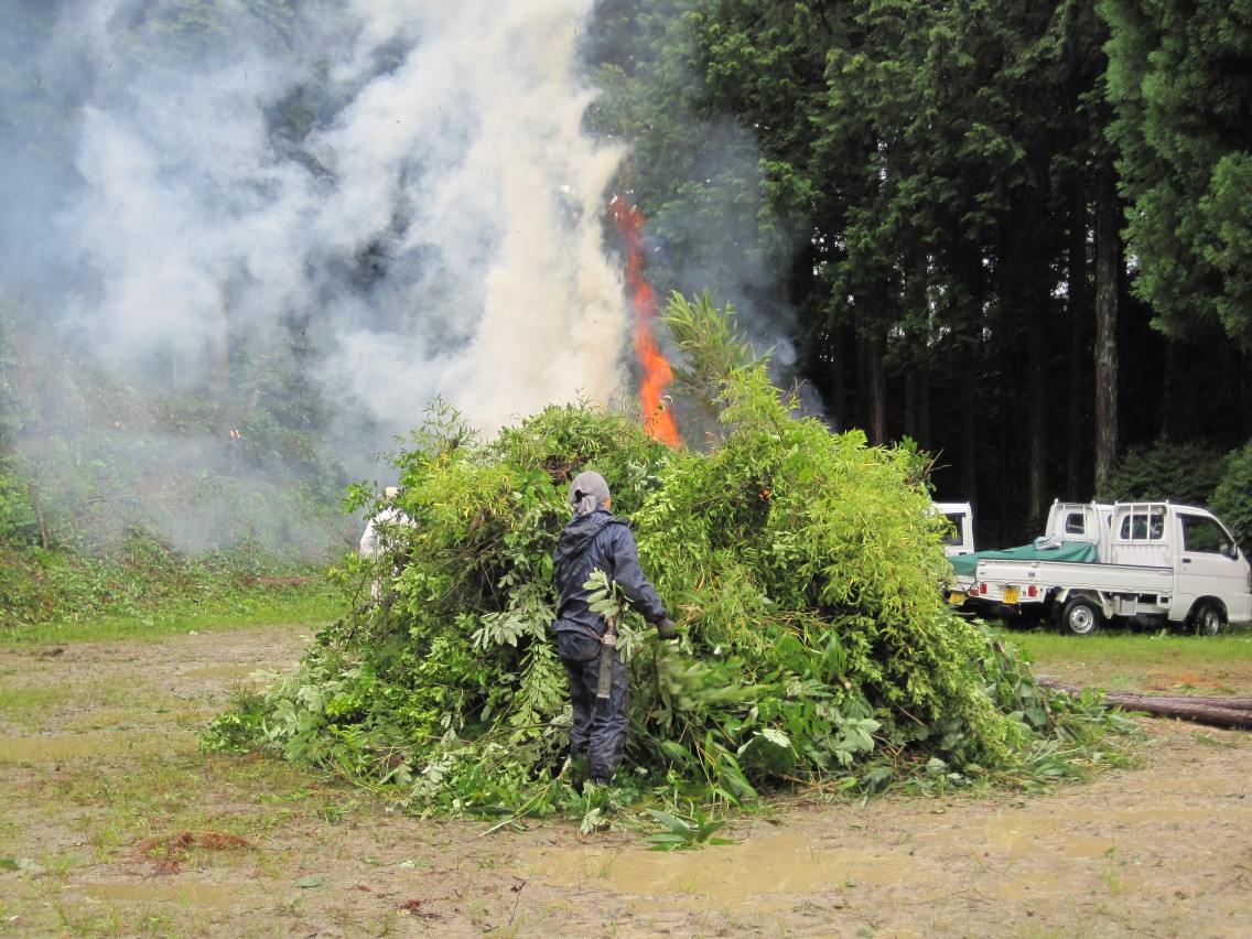 土手や木々の間にある草木を刈って、刈って、刈って、落ちてる枝を拾って、拾って、拾って、そして中央に集めるわけです。何をするか、もちろん燃やします。雨の中で火がつくのか、灯油かければ大丈夫です。