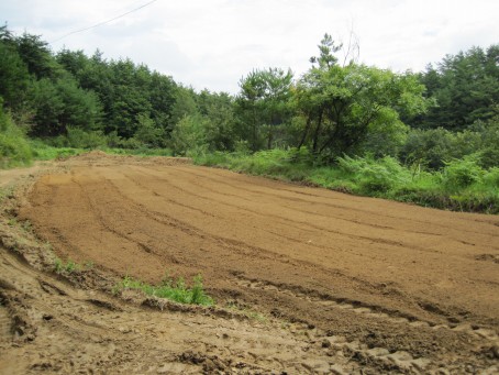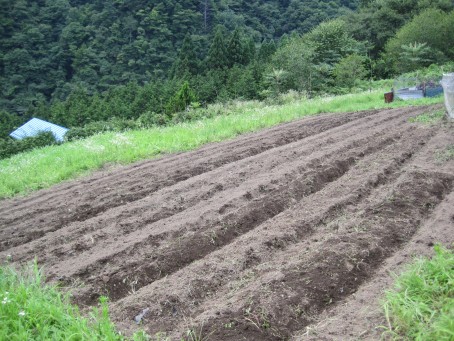 ←漆平野 畝立て直後 小型の機械で除草、耕耘後手作業で畝を立てた。
